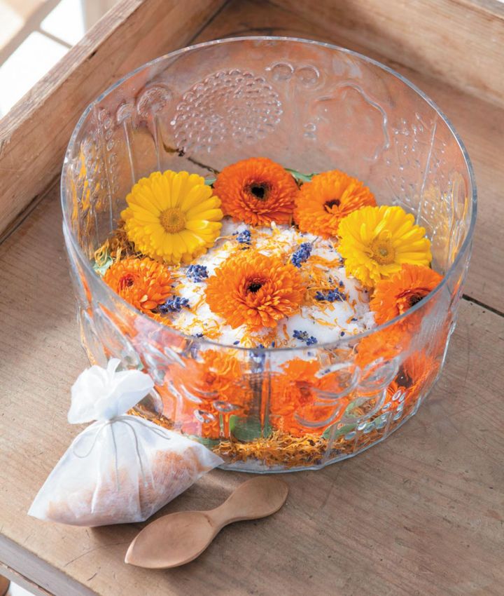 大ぶりで深めのガラスの器に、ドライやフレッシュのポットマリーゴールドの花びらと葉、ドライのラヴェンダーを混ぜた粗塩を入れ、表面にオレンジや黄のフレッシュな花をぽんぽんと置きました。ドライのラヴェンダーも並べて香りよく。