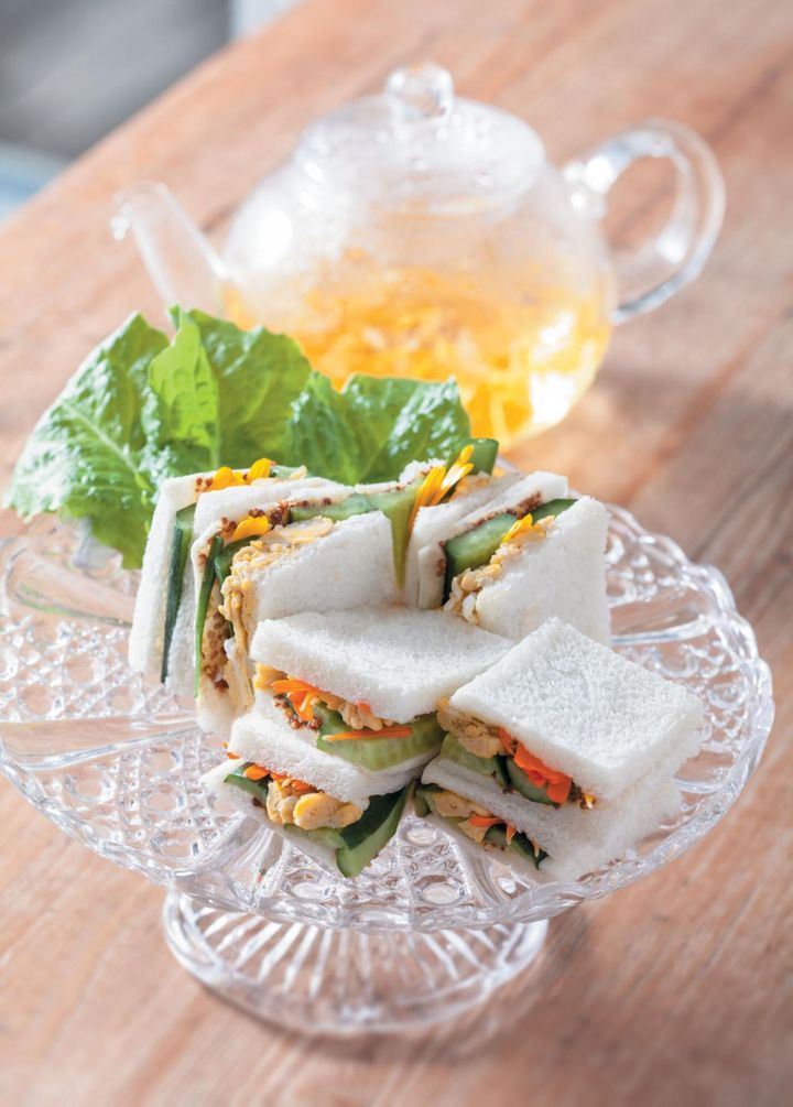 薄切りのきゅうりを使ったキューカンバーサンドはイギリス人の大好物で、ランチやアフタヌーンティーで供されることでもおなじみ。シンプルなサンドイッチにスクランブルエッグで風味とコクを出し、マリーゴールドの花びらで華やかさを添えました。緑、黄、オレンジの彩りがきれいです。