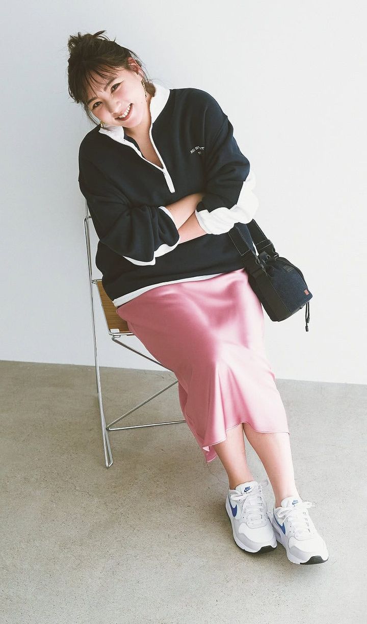 スポーティなジップアップにはサテンの艶をひとさじ。ラフさと女っぽさがちょうどよく混ざり合う、甘辛バランスの光る着こなしです。白スニーカーで抜け感を添えれば、軽やかな休日コーデに。