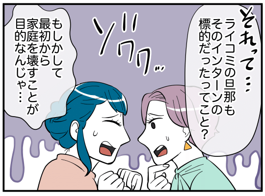 主人公と夫が勤めている会社でかつて起きた不倫騒動。しかも不倫していたのは1人ではないようだ。その不倫相手はインターンの女性で、関係をもつ前に必ず既婚者であること、子どもがいることを確認していたのだという…