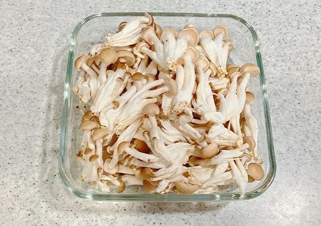 まず、シメジの石づきを切り落としたら、ほぐしながら耐熱容器に入れます。