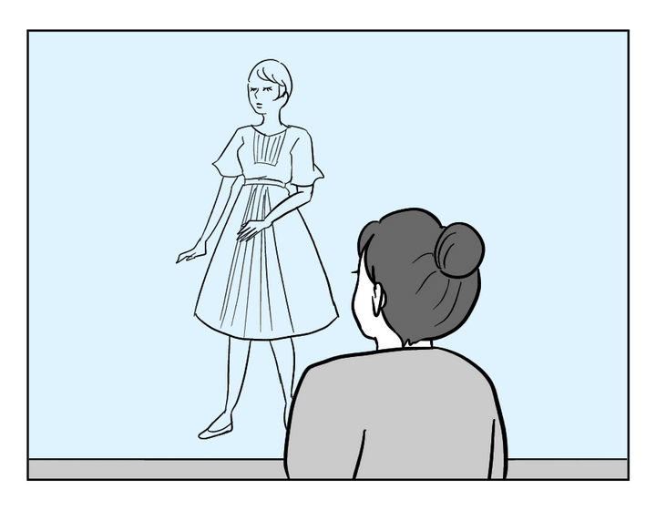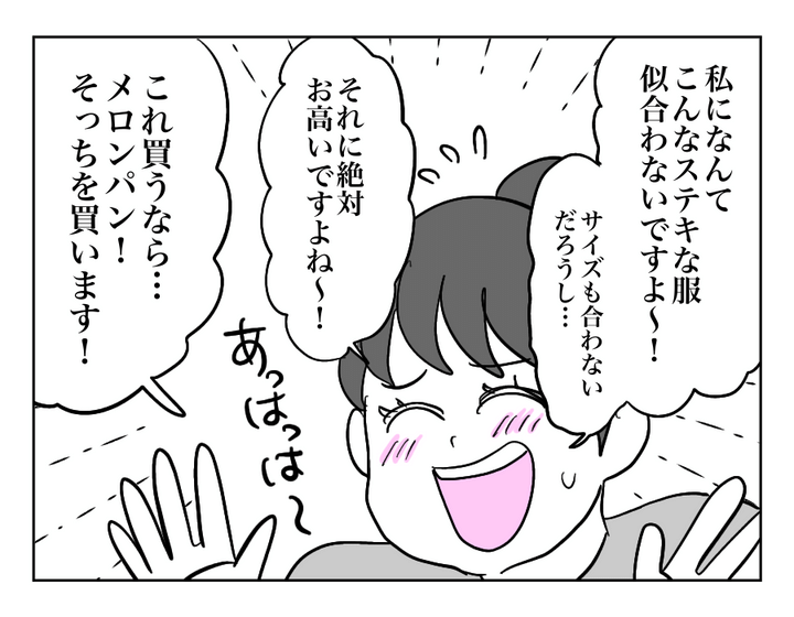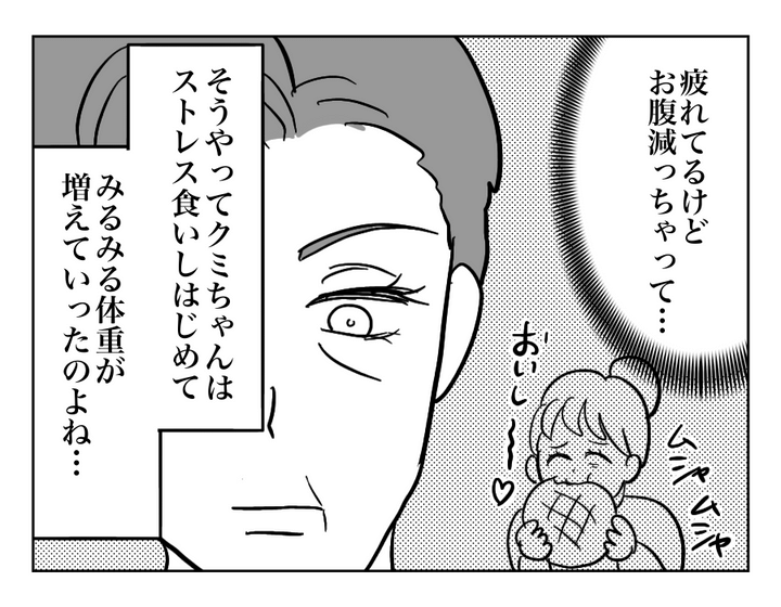 お義母さんが思い返していたのは、クミさんが買い物途中にショーウィンドーの前でふと足を止めていた記憶。そこにいたのは、ウエストの細いワンピースからすらりと手足を出したマネキンでした。結婚当時のスリムだったクミさんは、ずっとこんな服装をしていたのかもしれませんね。けれどクミさんが選んだのは、憧れのファッションよりも大好物のメロンパン。お義母さんはそんなふうにどんどん体重が増えていくクミさんを静かに見守ってきたようです。