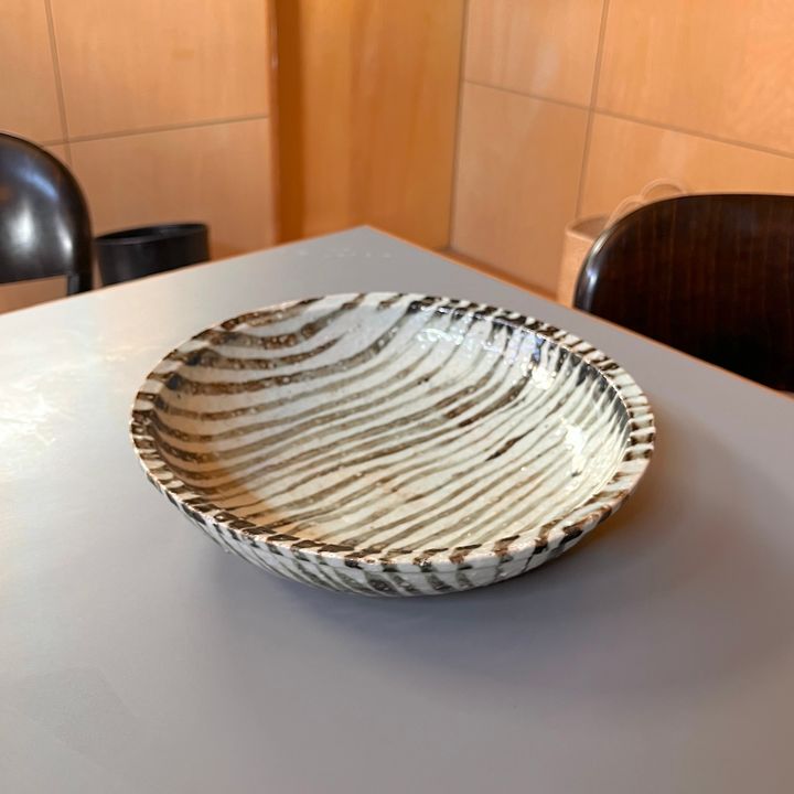 作者の手のブレブレな線と少し引っ掛かる釉薬の塊による剥れとテカリ。家庭料理を盛り付けるにはちょうどいい大きさで、自身の手抜き料理とも相性が良い。