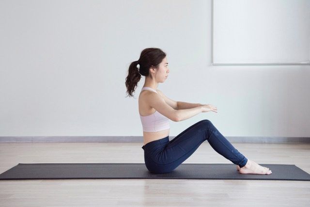 (1)脚を拳1個分を開けて床に座って背筋を真っ直ぐ(反り過ぎないように)、両腕は軽く前に伸ばしてボールを抱えむようなイメージで指先を合わせる