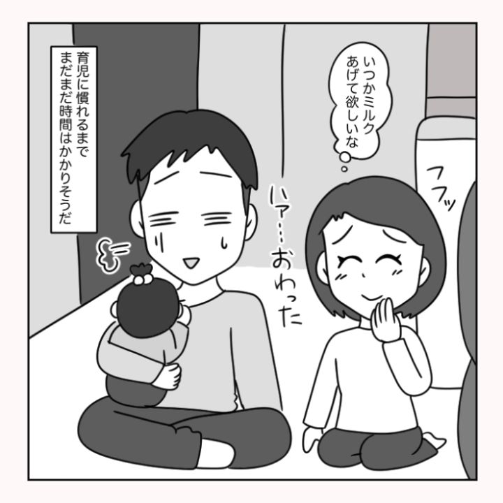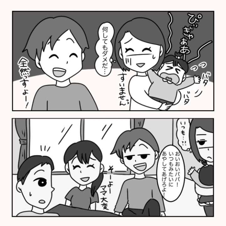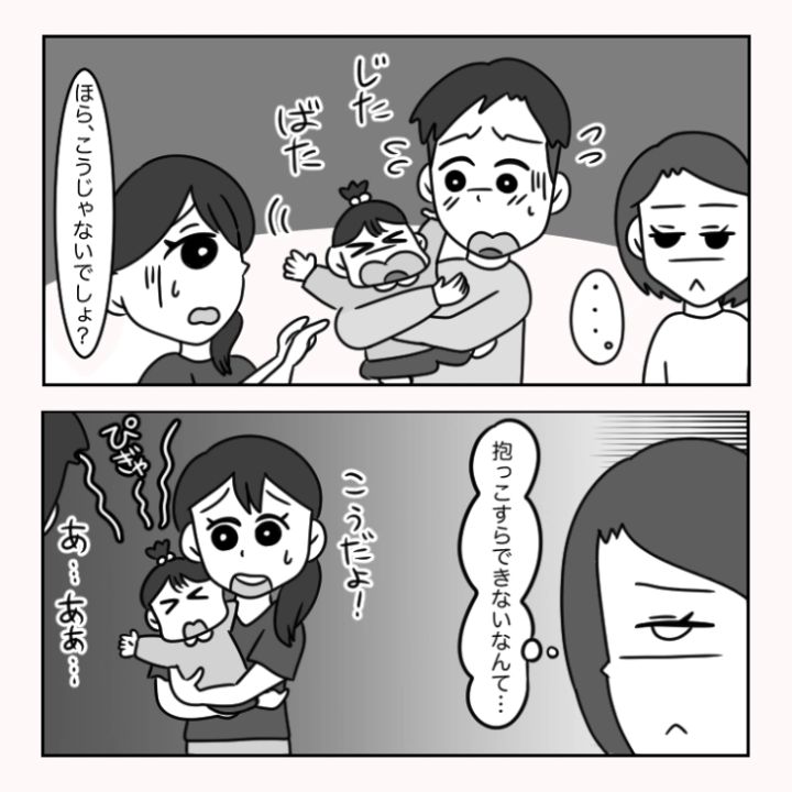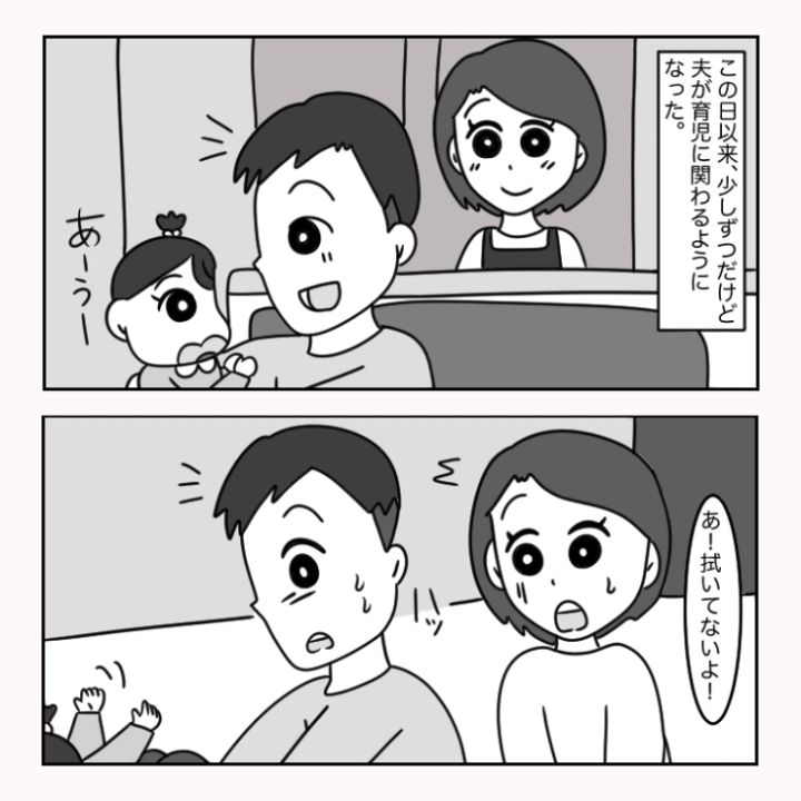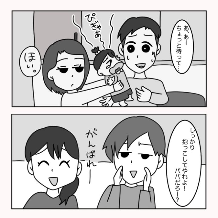 抱っこすることも泣き止ませることもできない姿を友達の前で見せてイクメンは偽りの姿だったことがばれた夫。相当ショックだったのかそれ以来少しずつ育児に参加するようになったようです。