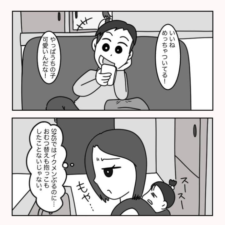 衝撃のエピソードを漫画化!今回は育児を一切しないのにSNSではイクメンアピールをしている夫の化けの皮が剥がれるお話をご紹介します。
