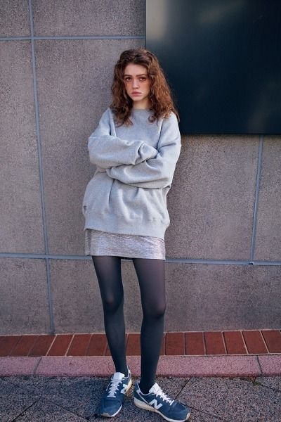 スウェットをかぶせて、ミニスカートの見える面積をさらに小さくしぼる。グレーとシルバーが一体化して見えることで、メタリックのキレがリラクシーなスウェットにも付加。