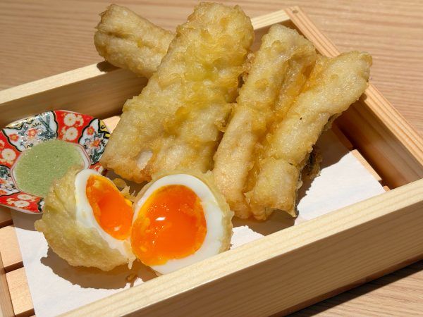 穴子の一本揚げは、びっくりするほどふわふわ~!天つゆがじゅわっと染みるたまごの天ぷらも。