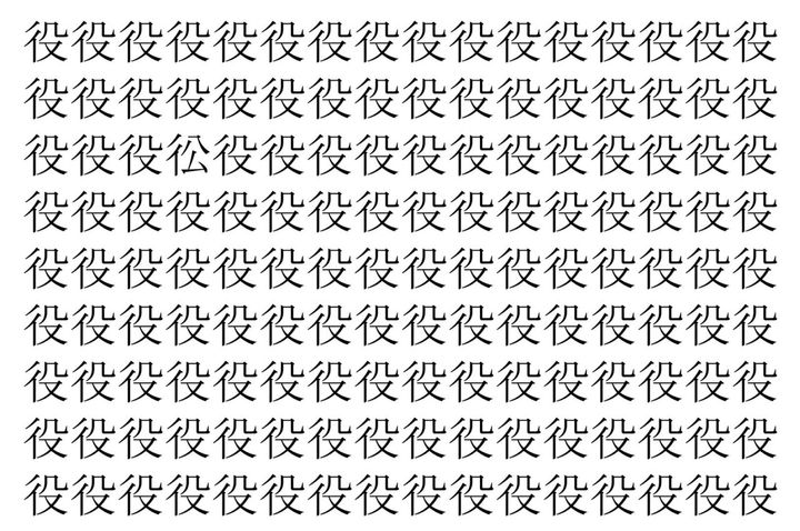 画像の中には、「役」という漢字が縦に9行、横に16個並んでいます。 全部で144個となりますが・・・、そのうち1つは「異なる漢字」となってますよ!!