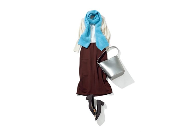 ニットポロアンサンブル(カーディガン)¥3,990/GU ロゴTシャツ¥3,498/ロペピクニック(ジュン) タイトスカート¥5,489/ロペピクニック(ジュン) ストール¥35,200/ドレスレイブ(ジオン商事) スクエアパンプス¥9,900/RANDA シルバーショルダーバッグ¥11,000/アルテミス by ダイアナ(アルテミス by ダイアナ アーバンドック ららぽーと豊洲店)