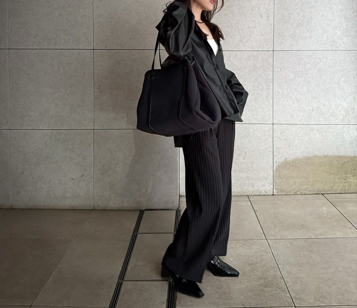特に注目なのは、ボトムスの縦ラインがきれいなパンツ。黒のジャケットをさらっと羽織り、白のインナーをチラ見せすることで、重くなりがちな全身黒の着こなしに抜け感が生まれています。さらに、大きめのトートバッグを合わせれば、荷物が多い日でもおしゃれを諦めない、大人のためのデイリーカジュアルが完成です。