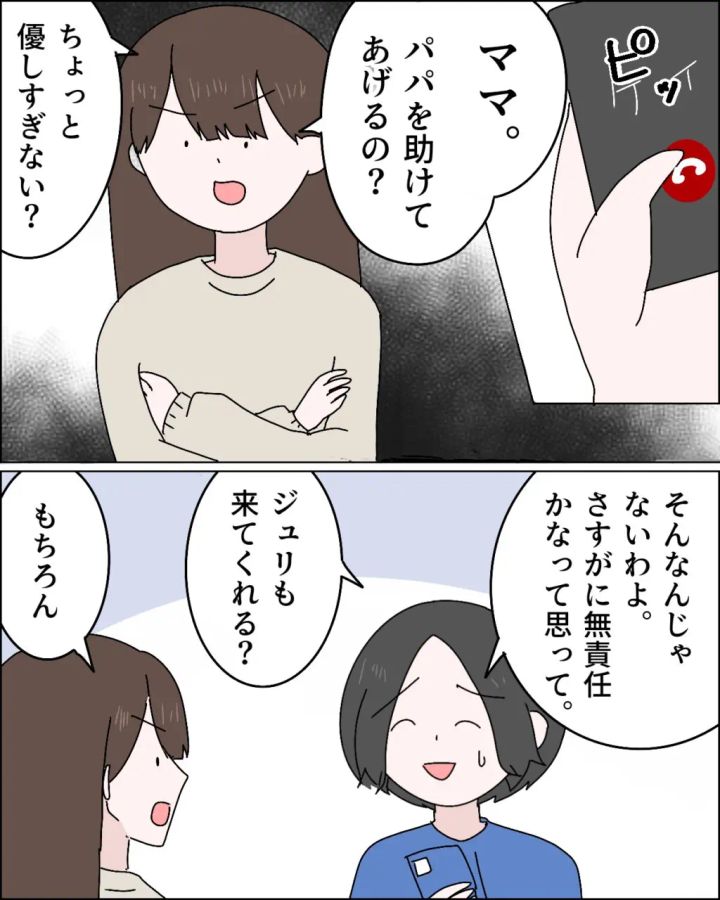 リナさんとケイさんの電話のやり取りを聞いていたジュリちゃんは、「ママ。パパを助けてあげるの?ちょっと優しすぎない?」と納得のいかない様子。「そんなんじゃないわよ。さすがに無責任かなって思って。ジュリも来てくれる?」とリナさんが言うと、ジュリちゃんは「もちろん」と快諾しました。