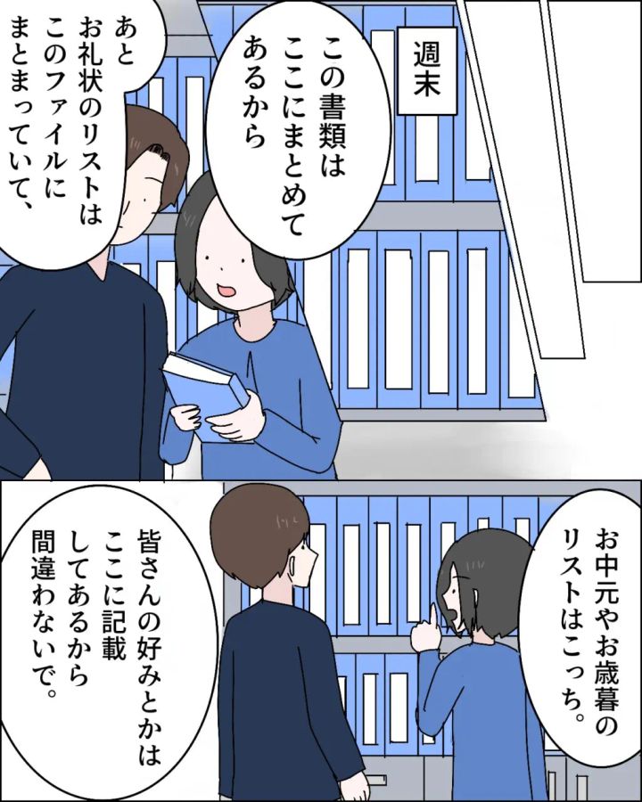 そして週末。リナさんは「この書類はここにまとめてあるから。あと、お礼状のリストはこのファイルにまとまっていて、お中元やお歳暮のリストはこっち。皆さんの好みとかはここに記載してあるから間違わないで」と丁寧にケイさんに説明。