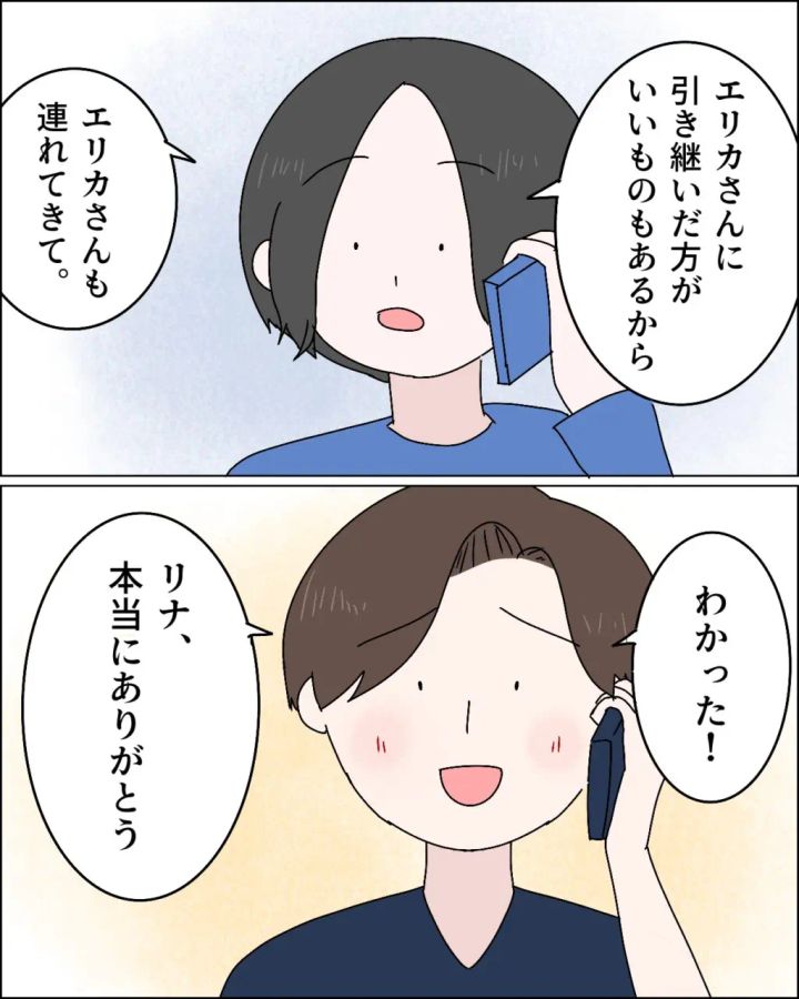 「エリカさんに引き継いだ方がいいものもあるから、エリカさんも連れてきて」とリナさんが言うと、「わかった!リナ、本当にありがとう」とケイさんは感謝します。
