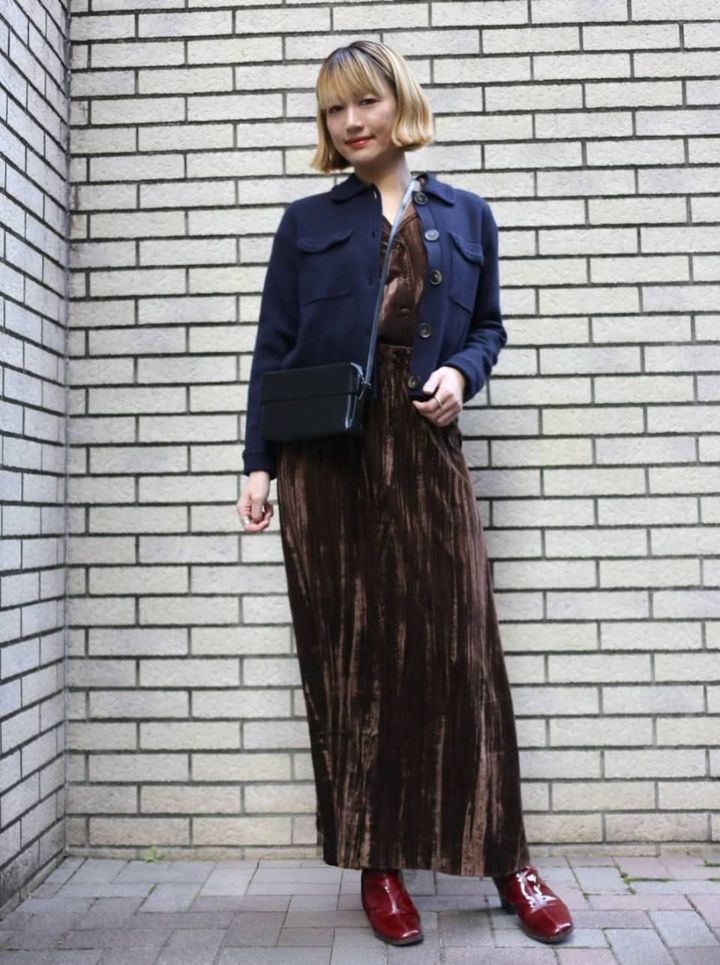 「季節ごとに新色が登場するSézaneのシグニチャーニットを主役に、中にはツヤ感が上品なベロア素材のセットアップを合わせてレディなスタイルに仕上げました。寒暖差があるので、素材で冬らしさを楽しみつつ、脱ぎ着できるコーディネートにしたのもポイントです」