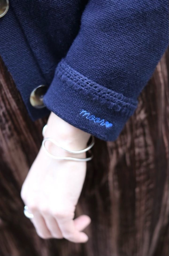 「薄手で軽く羽織るのに最適なニットは、同じ形で2枚持っているほどお気に入り。特に推しポイントは袖口に好きな糸で刺繍を入れられる無料のサービスがあること。まわりでは愛猫愛犬の名前を入れたり、フランス語でmaman(お母さん)としたり。私は袖に弊社の名前『moor♡』と刺繍して愛用しています」カーディガン¥25,000(セザンヌ)