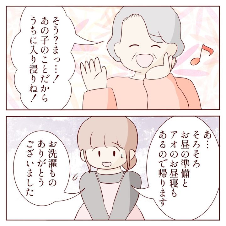 すると義祖母は嬉しそうに「まっ、あの子のことだからうちに入り浸りね!」と言いました。リクが自立できないのを私のせいにするくせに、頼られるとなると嬉しいんだ・・・と、ヒナさんは呆れてしまいます。「そろそろお昼の準備とアオのお昼寝があるので」と告げ、義祖母の家を後にしました。