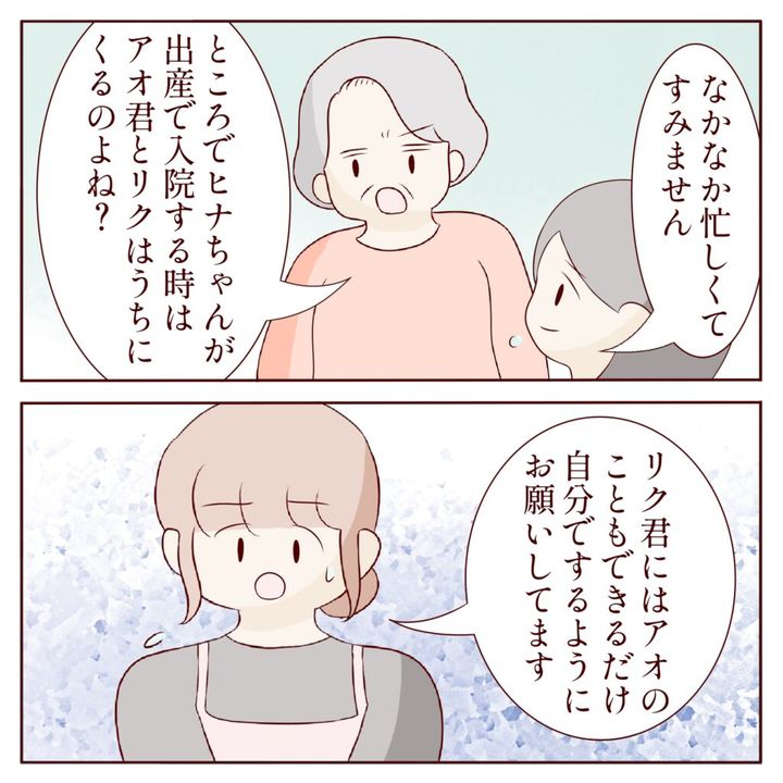 「ところで、ヒナちゃんが出産で入院するときはアオくんとリクはうちにくるのよね?」ヒナさんが出産で入院する間のことが気になったのか、義祖母がそう問いかけてきました。ヒナさんは、「リクくんには、アオのこともできるだけ自分でするようにお願いしてます」と義祖母に頼るつもりはないことを伝えました。