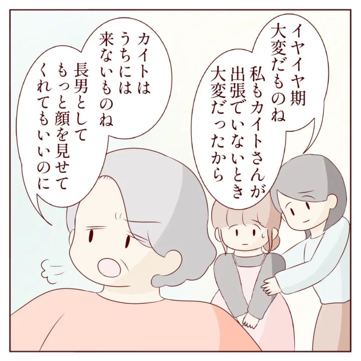 義祖母の言葉に落ち込むヒナさんを見て、「イヤイヤ期大変だものね、私もカイトさんが出張でいないとき大変だったから」とカナコさんはそっと寄り添うように声をかけました。ところが義祖母は不満げな表情で、「カイトはうちには来ないものね、長男としてもっと顔を見せてくれてもいいのに」一言付け加えます。