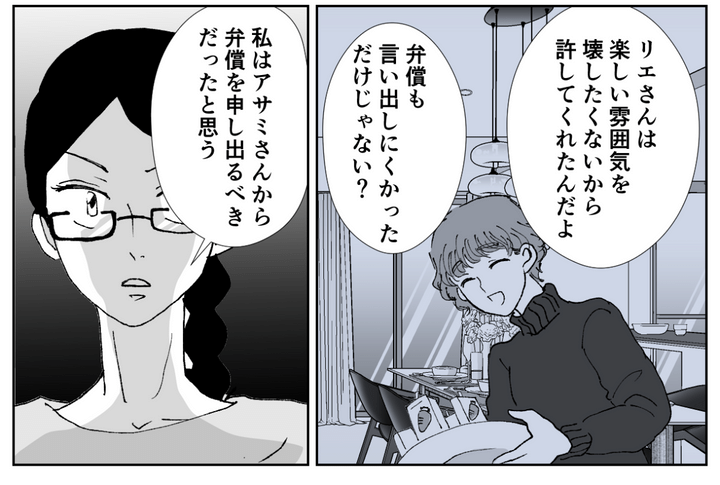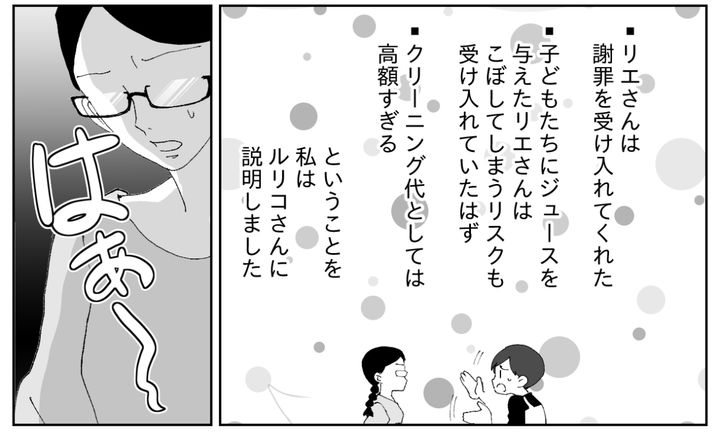 私はアサミ(30)。とある都市に住む、年少男の子(リク)のママです。先日、ママ友・リエさんのお家に、私とルリコさんとサキさん親子で遊びに行きました。しかし私たちがおしゃべりに夢中になっているあいだに、息子がソファに野菜ジュースをこぼしてしまいました。私はすぐに謝り、リエさんは「気にしないで」と許してくれました。しかし後日ルリコさんから、「クリーニング代をみんなで負担しない?」との提案が……。納得できず、はっきりしないままやり過ごそうと思っていたのですが、そのことで悪い噂が広まってしまったようで、私も他のママたちから家に呼ばれなくなってしまいました。