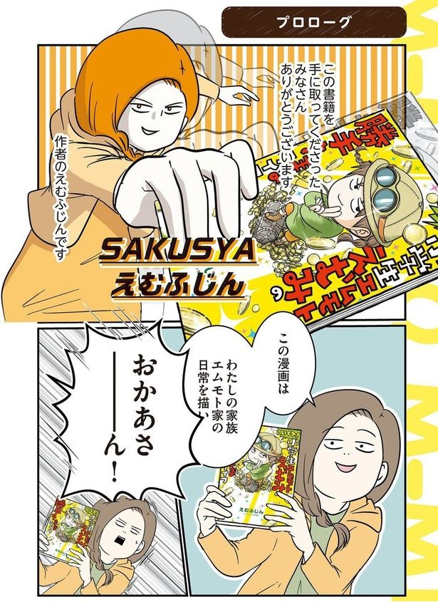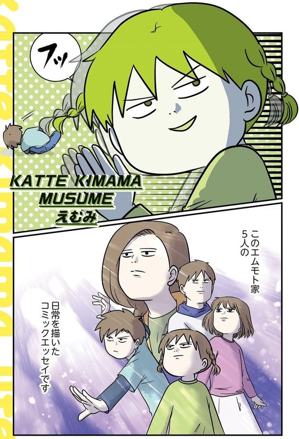 5人家族のエムモト家は、ツッコミかつ天然ボケの母、常識人だけど時々幼い父、ゲーム好きで斜に構えた長男、石集めが大好きな長女、そして自由人な末娘の小学生・えむみ。特にえむみの破壊力はひときわ輝く!