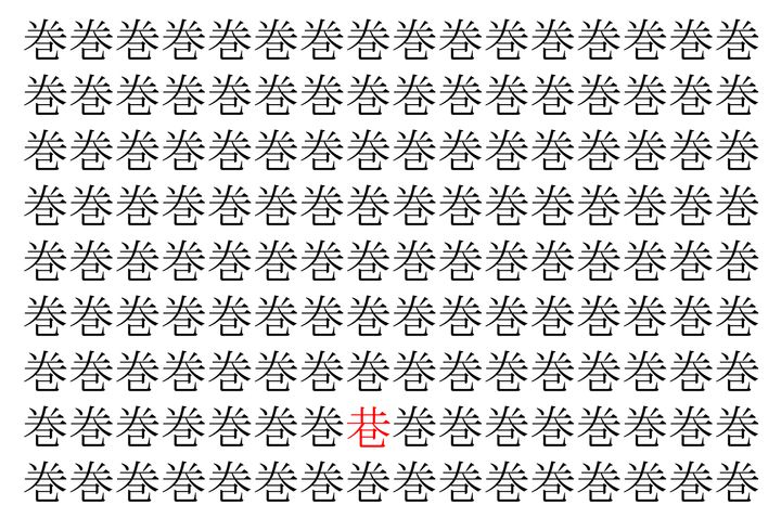 画像の中には、「巻」という漢字が縦に9行、横に16個並んでいます。 全部で144個となりますが・・・、そのうち1つは「異なる漢字」となってますよ!!