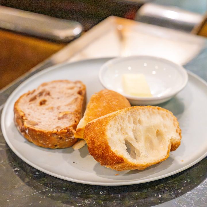下段には、香ばしく焼き上げられたバゲットやナッツ入りパンなど、数種類のパンをバターと共に提供。