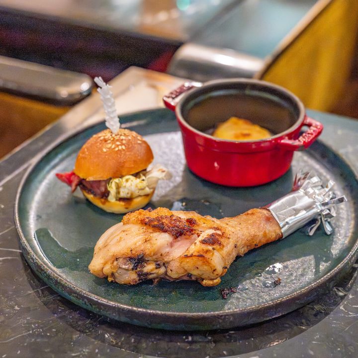 ローズマリーの香りが広がる「骨付きローストチキン」は、ジューシーで柔らかく、ボリューム満点!