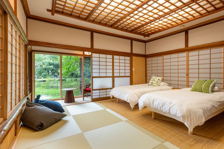 「湧玉池」がすぐ目の前に広がる、1階「水の間」。3名まで利用可。
