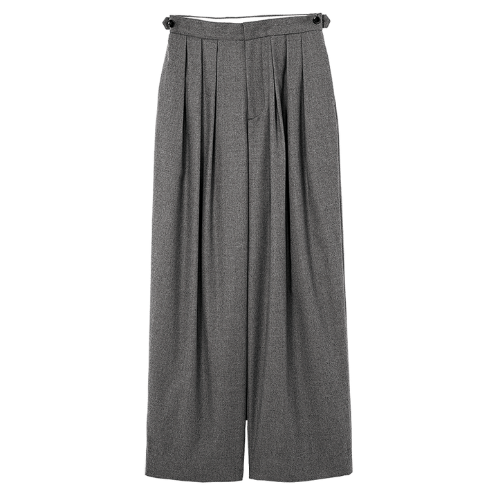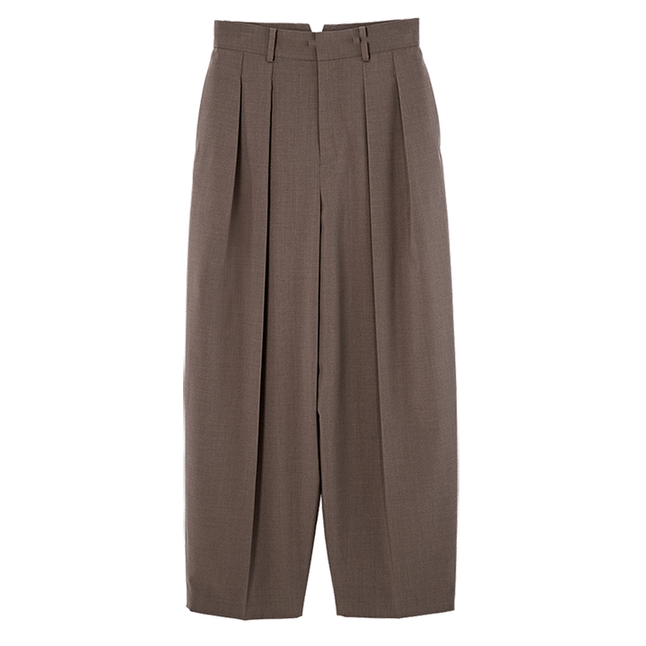 チェックパンツと同様に太めが気分ですが、今季多いダブルタックを選べば安心。ヒップまわりもカバーできる上に、こなれたムードが出せます。シューズにかぶさるくらいのやや長め丈が正解バランスです。