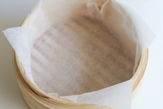 ① せいろを水で濡らして、クッキングシートを敷く。
