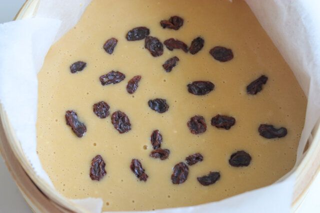 ⑥ せいろに生地を流し、レーズンをちらす。
