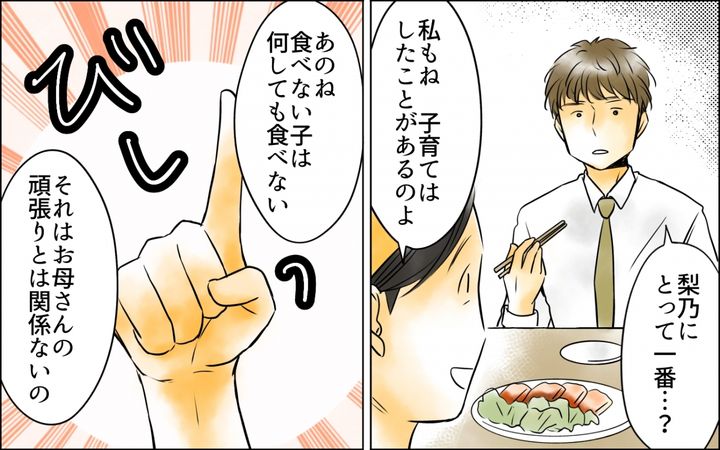 娘の偏食について無理解な上に無責任な口ばかり挟んでくる夫に反発し、妻は夫の食事を作らなくなった。夫は行きつけの店で妻の料理を馬鹿にし、自分の母に料理を頼むと言い出すが、店主に「娘さんはあなたのお母さんの料理を食べないと思うよ」と言い諭されてしまい…。