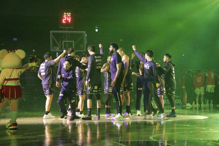 両チームの先発選手の発表が始まりました。最後にブレックスのエース#6 比江島選手が登場すると、ブレックスの選手は、コート中央で円陣を組みました。