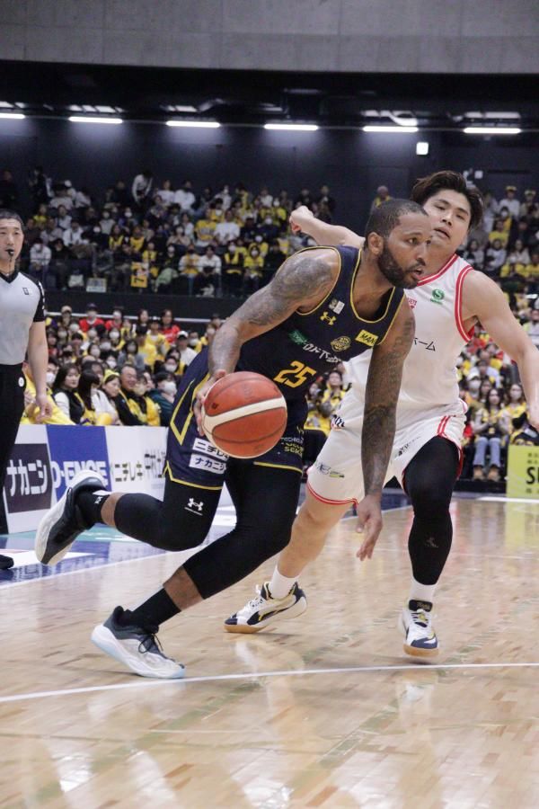 #25 ニュービル選手は、厳しいマークの時は、味方へのパスに切り替えて、相手守備陣を翻弄しました。第2Q終盤から第3Qに掛けて、相手守備の強度が下がると、攻撃的なドライブで得点を重ねていきました。