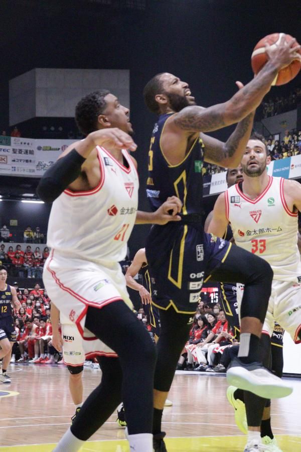 相手の守備が甘くなった時には、果敢に相手ゴール下までドライブで切り込んで、得点を狙いに行きました。
