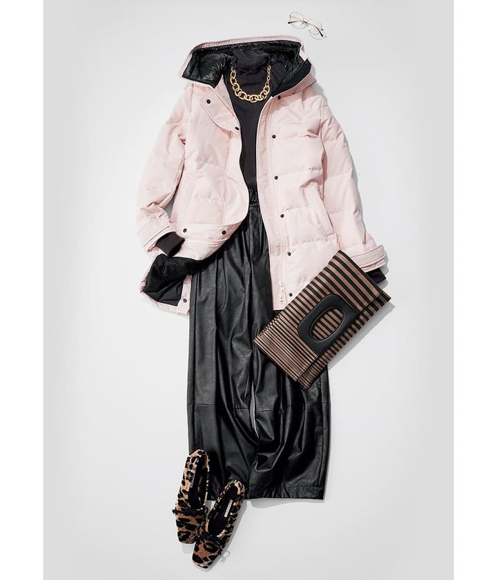 ピンクダウンコート¥242,000(カナダグース/カナダグースジャパン)ハイネックニット¥17,600(プランクプロジェクト/プランクプロジェクト 青山店)エコレザーパンツ¥39,600(サクラ/インターリブ)バッグ¥61,600(ゲラルディーニ/クイーポ)パンプス¥47,300(ピッピシック/ベイジュ)メガネ¥25,740(レイバン/ルックスオティカジャパン カスタマーサービス)チェーンネックレス¥46,640(ベン・アムン/ZUTTOHOLIC)
