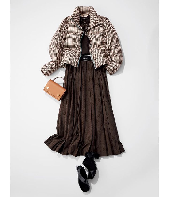 チェック柄ダウンジャケット¥104,500(ウールリッチ/ウールリッチ 二子玉川店)カットソー¥11,000パンチングスカート¥33,000(ともにダブルスタンダードクロージング/フィルム)バッグ¥89,100(RSVP Paris/クイーポ)ミュール¥39,600(ペリーコサニー/アマン)サングラス¥56,100(モスコット/モスコット トウキョウ)