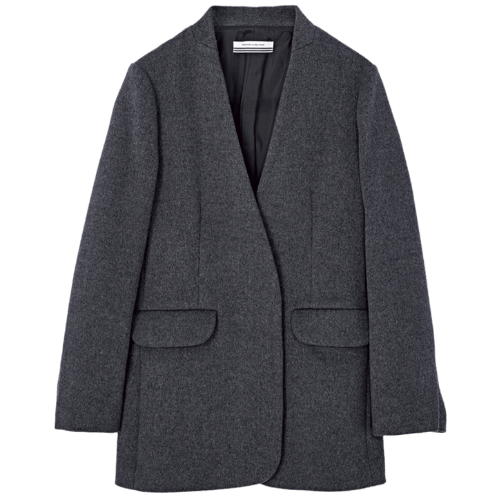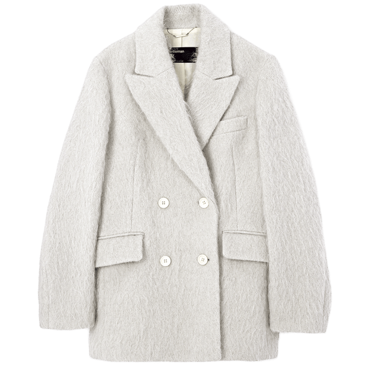 「ブルーフォックス、モヘア、ウールをMIXしたオリジナルの生地で、無染色ならではのペールグレーカラーが特徴。アームホールが広めなので、厚手のニットも着られます」Chaos PR・小林明日香さん