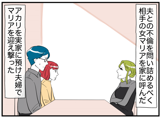 主人公が勤めている会社で不倫をくり返していた矢部マリア。そしてどうやら夫もその標的になってしまったようだ。彼女の目的は一体なんなのかー。矢部マリアを家に呼び、直接問い詰めることにした。