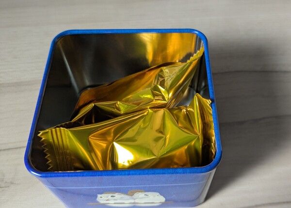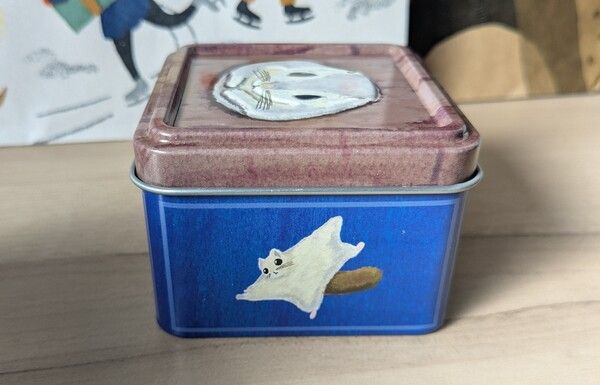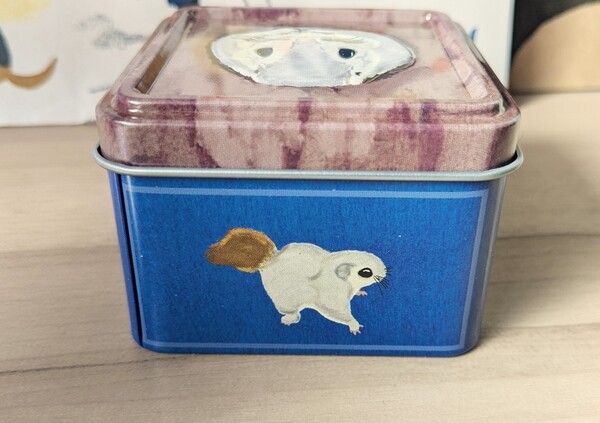 エゾモモンガのイラスト入りの缶です。個包装のチョコクランチ2個入っています。