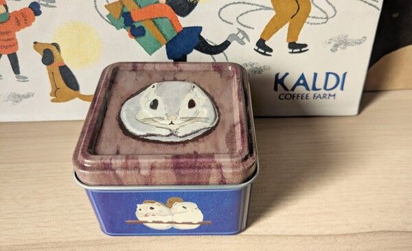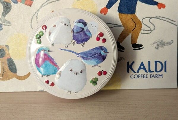 カルディオリジナル「数量限定・ホリデークッキー缶シマエナガとムシクイ柄」