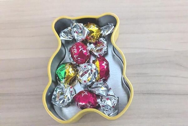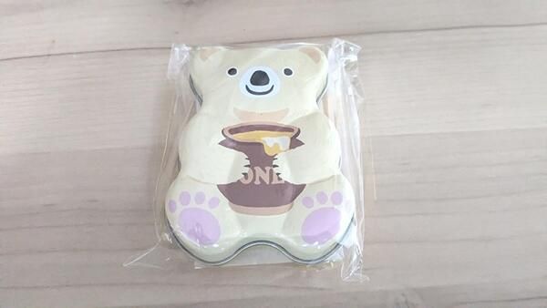 かわいいベアが描かれたデザイン缶にボールチョコレートが入っています。