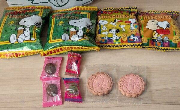 スヌーピーのイラストが描かれたコンフェクショナリーバッグの中には、ビスケット12g×2袋、スヌーピー柄焼菓子(ストロベリー風味)5g×2個、スナック菓子10g×2袋、準チョコレート3g×2個、キャンディ(ストロベリー風味3g×1個、マスカット風味3g×1個が入っています。