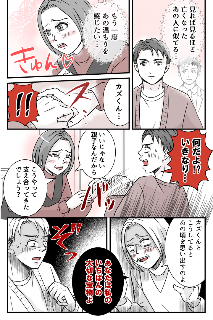 ようやく訪れたカズキと2人きりの時間。見れば見るほどカズキは亡き夫に重なって見えます。「もう一度、あの温もりを感じたい……」思わず私は、カズキの手にそっと自分の手を重ねようとしました。ところがカズキの反応は冷ややかでした。