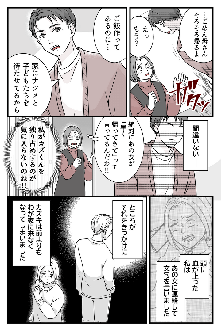 ある日、ひとりで来てくれたカズキの手にそっと触れようとしましたが、冷たく拒否され、抱きしめようとしたところ振り払われてしまいました。カズキは「家族が待っているから」とすぐに帰ってしまい、私は「あの嫁が早く帰るよう仕向けている!」と怒りの電話をかけました。