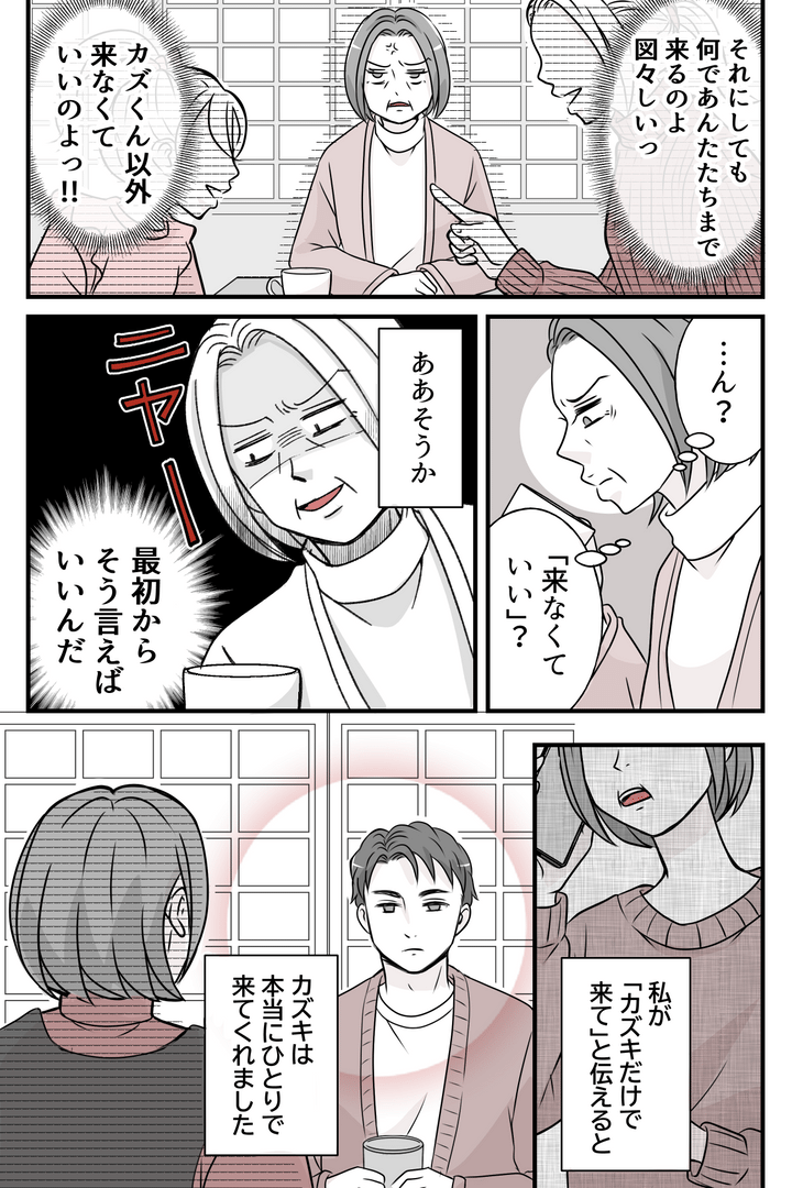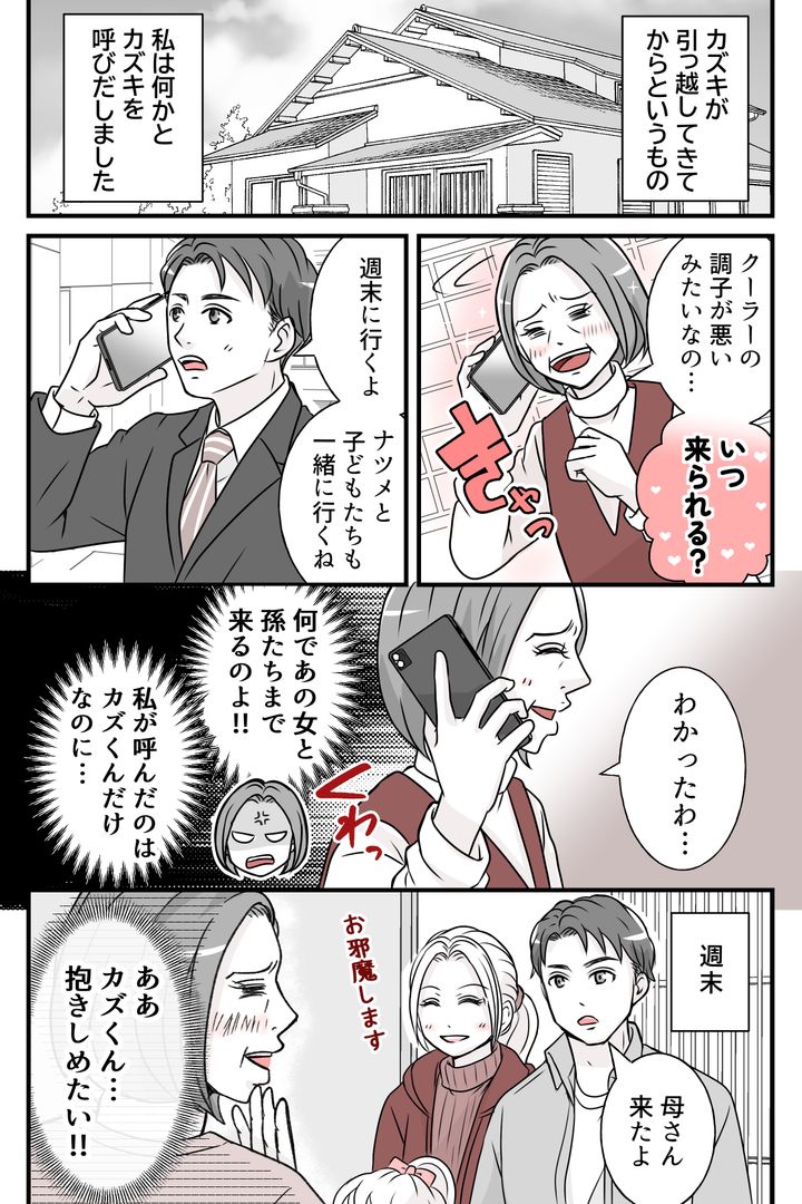 カズキが引っ越してきてからというもの、私は何かとカズキを呼び出しました。けれど毎回、あの女と孫たちも一緒にやってきます。カズキだけが来てくれればいいのに……。そうだ! 最初からそう言えばいいのです。その後私はカズキに、「次からはカズキだけで来て」と伝えました。