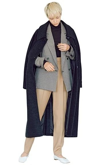 ダッドなムードのチェック柄ジャケットとスラックスの組み合わせ。シルエットを整える黒のウールコートでタテに流せば、辛口なムードはキープしながら、なつかしさのあるジャケットに切れ味と奥行きを足す役割も。