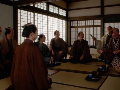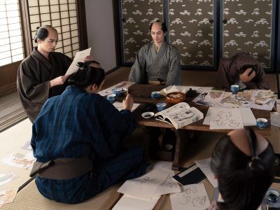 耕書堂には朋誠堂喜三二(尾美としのり)、山東京伝(古川雄大)、大田南畝(桐谷健太)、北尾重政(橋本淳)らが集まり、作品について久しぶりに案を出し合います。定信の治世に解散した蔦重率いるクリエイターチーム。彼らの賑やかなアイデア出しの風景はもう見られないと思っていましたが、再び集結し、また一緒に作品を作り始めることになりました。