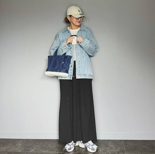 ロングスカートをラフに着こなしたいときは「デニムジャケット」が最適。カッチリしたシルエットのため長いスカートがバランスよく収まり、大人っぽいカジュアルコーデに。Tシャツとスニーカーを合わせるとより馴染みますよ。